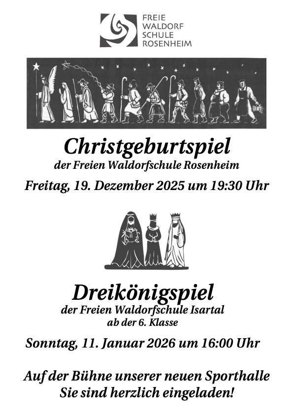 Sie sind herzlich zu unserem diesjährigen Christgeburtspiel eingeladen! Hier können Sie das Plakat vergrössern: Christgeburtspiel Wir freuen uns sehr, dieses Jahr auch das Dreikönigspiel der Kumpanei der Waldorfschule Isartal zu