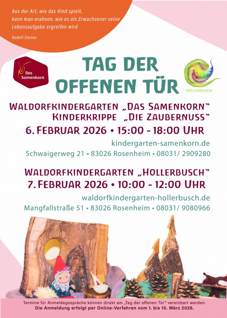 Tag der offenen Tür der Rosenheimer Waldorfkindergärten Samenkorn und Hollerbusch Am 6. und 7. Februar sind alle Interessierten herzlich zum Tag der offenen Tür in die Rosenheimer Waldorfkindergärten eingeladen. Am Freitag,